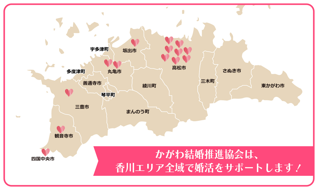 香川県を中心に愛媛県・岡山県・徳島県・高知県などの隣接県とのご縁も橋渡しする地域密着型の結婚相談所協会です。